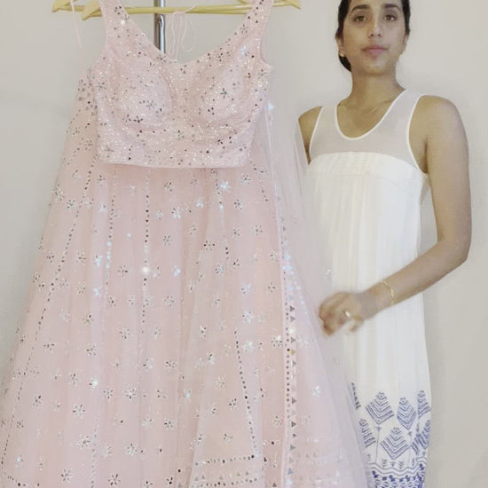 Featuring a baby pink net lehenga with mirror and stone work paired with a matching blouse and dupatta.