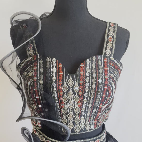 Featuring an organza black lehenga with red floral detailing paired with a sleeveless blouse with mirrorwork and embroidery and a net ruffle dupatta.