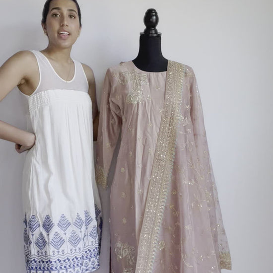 Featuring a silk based kurta with sequin work all over, paired with a matching cigarette pant and organza dupatta with sequin embroidery.