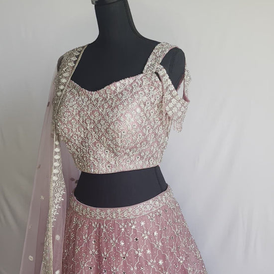 Featuring a net based lehenga covered with mirror and stone work paired with a matching off the shoulder blouse and net dupatta.