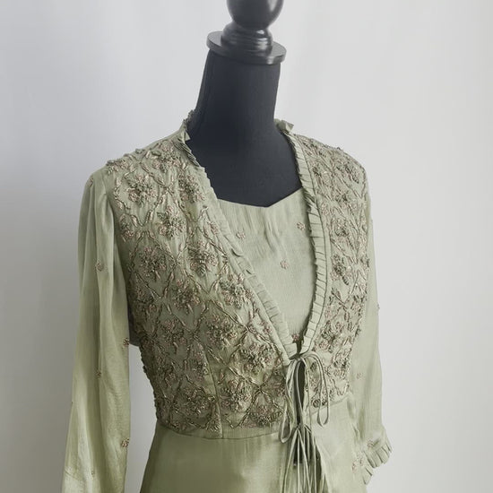 Featuring a crepe asymmetrical coat with 3D zardosi work paired with a matching crop top and tiered garara pants.