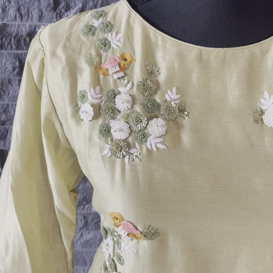 Featuring a silk olive green top with 3D embroidery and waterfall sleeves paired with a crepe lehenga and net dupatta.