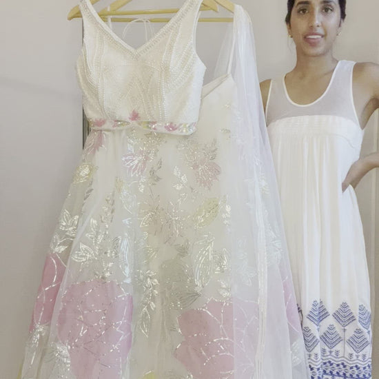 Featuring a white net lehenga with a floral pastel pattern in silver detailing paired with an entirely net blouse covered in pearl work and a net dupatta with matching florals.