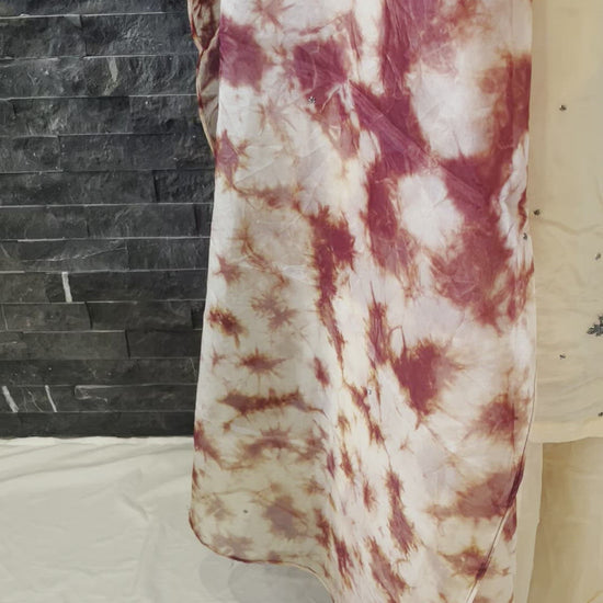 Featuring a peach crepe kurta with hand embroidery and stonework paired with matching sharara pants with tassels and a tie dyed organza dupatta.