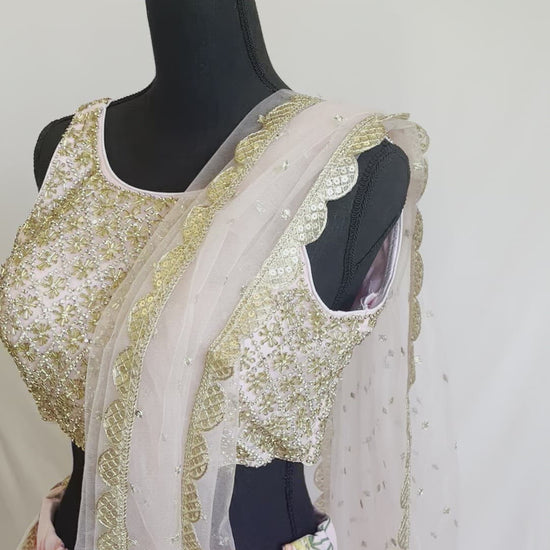 Featuring a georgette based printed lehenga with gotapatti and gold sequin work paired with a net blouse covered in gold stonework and a net dupatta with a matching border.