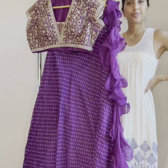 Featuring a crepe bandhani print lehenga paired with a fully embroidered v-neck blouse, ruffle dupatta, and belt.