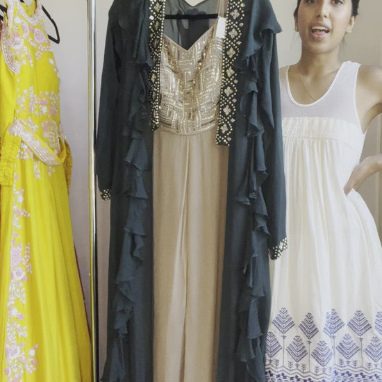 Featuring a tan chiffon based jumpsuit with net sleeves and metal embellishments, paired with a forest green overcoat with ruffles and matching embellishments.